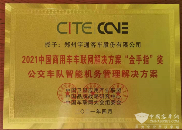 宇通作为本次参评企业,先后经过参评材料审查、业界影响力认定、专家评估等层层选拔,并颁发奖项,给予了宇通车联网产品极大的肯定。
