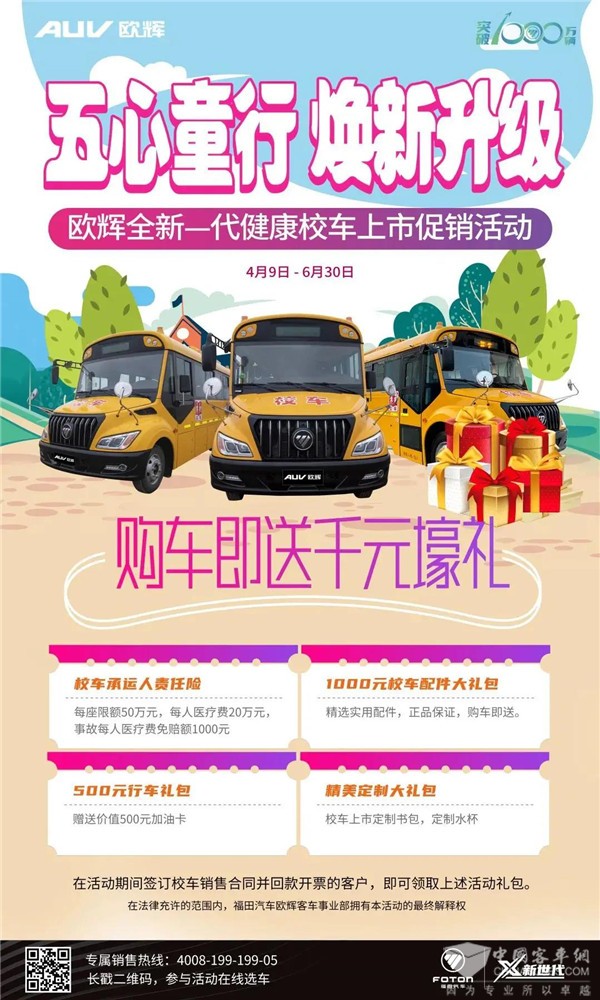 “五心童行 焕新升级”欧辉全新一代健康校车上市促销活动正在进行中,4月9日起至6月30日活动期间购车即送千元壕礼,欢迎选购!