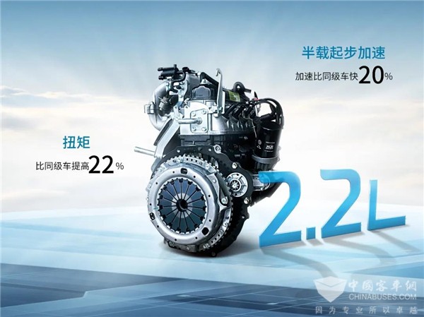 新款发动机低转速,高扭矩,2400转扭矩可达198N/m,扭矩比同级车提高22%;起速快,强有力,半载状态下0-100km/h加速仅需24.76s,半载起步加速比同级车快20%;载质量比同级车提升52%;同时满足国六b排放标准。