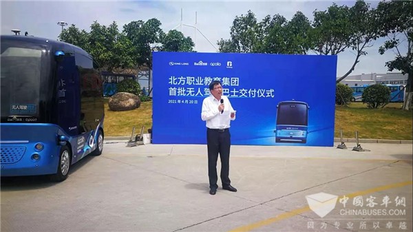 陈总表示:此次北方职业教育集团采购的4辆阿波龙自动驾驶巴士是百度与金龙联合打造的中国首款L4级自动驾驶微循环电动巴士,整车没有方向盘、制动、驱动踏板,技术水平已达到国际领先水平,标志我国在无人驾驶领域取得的非凡成就。