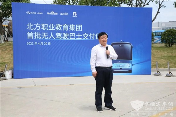 曹董事长在致辞中表示:北方职教30年来只做一件事,那就是研究汽车和教学生修车。作为一家民营职业教育机构能够跟百度、金龙这样的重量级企业合作,是集团紧跟市场需求、追赶汽车科技、快速迭代课程、深化落实产教融合的重要举措。本次首批订购的自动驾驶汽车将投放在石家庄、郑州的学校及实训基地,用于学生的体验、学习以及教具研发。
