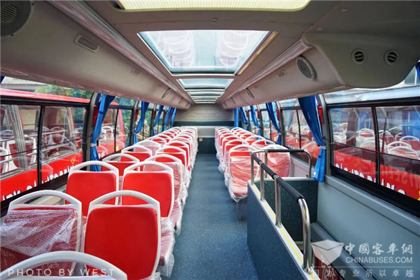 车内配备高档旅游座椅,上下两层可乘坐83人,单车的成本实现双车的利润,给运营单位带来更多价值;专设无障碍乘车设施和轮椅区、USB充电接口、防滑耐磨踏步楼梯及铝合金裹花扶手等人性化设施,保证乘客舒适性;多国语音系统支持同步翻译多种语言,极大方便了来自不同国家和地区的游客参观讲解需要,让红色文化之旅更加别开生面。