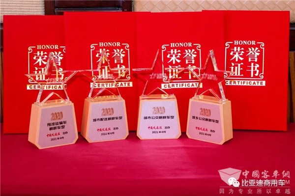 2021年4月24日,由中国交通报社主办的“把脉市场需求、聚焦用户口碑——2020中国运输服务榜样车型推选发布会”在北京隆重举行。凭借产品创新力、市场认可度以及强大综合实力,比亚迪再获行业认可,揽获2020“城市公交榜样车型”“城乡公交榜样车型”“城市配送榜样车型”“甩挂运输榜样车型”四项大奖,为助推运输服务高质量发展再添一份激励。