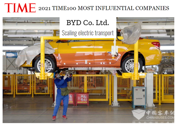 2021年4月27日,美国《时代周刊》(TIME)评选出了“最有影响力的100家企业”(2021 TIME100 Most Influential Companies),比亚迪成功入选,成为榜单上唯一来自中国的新能源整体解决方案供应商。