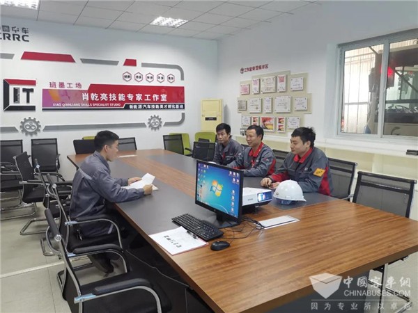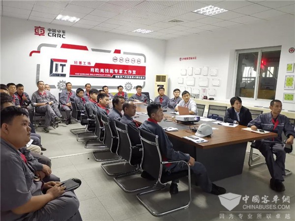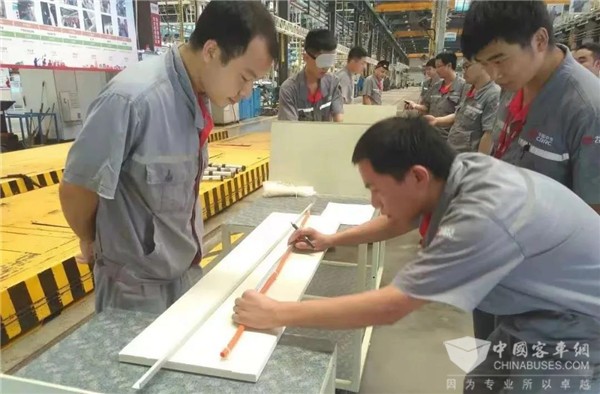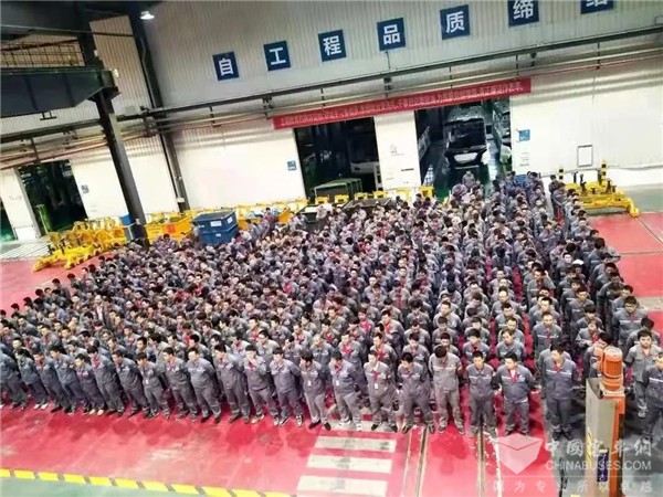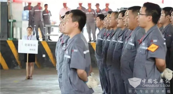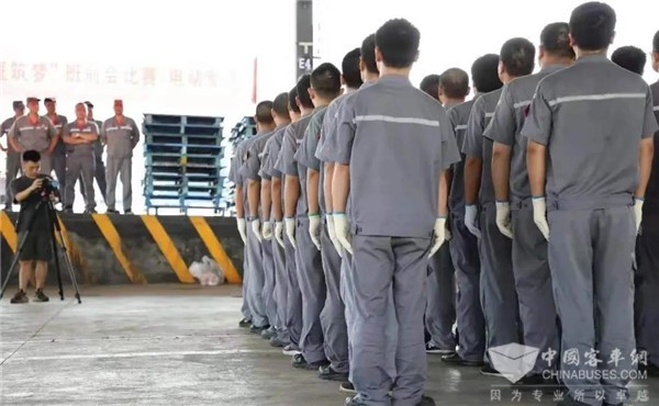 “稍息、立正、向左转......现在通报今天的安全事项、工作重点......”客车事业部总装车间每天以晨会方式,开始一天的工作。他们个个精神抖擞、斗志昂扬!