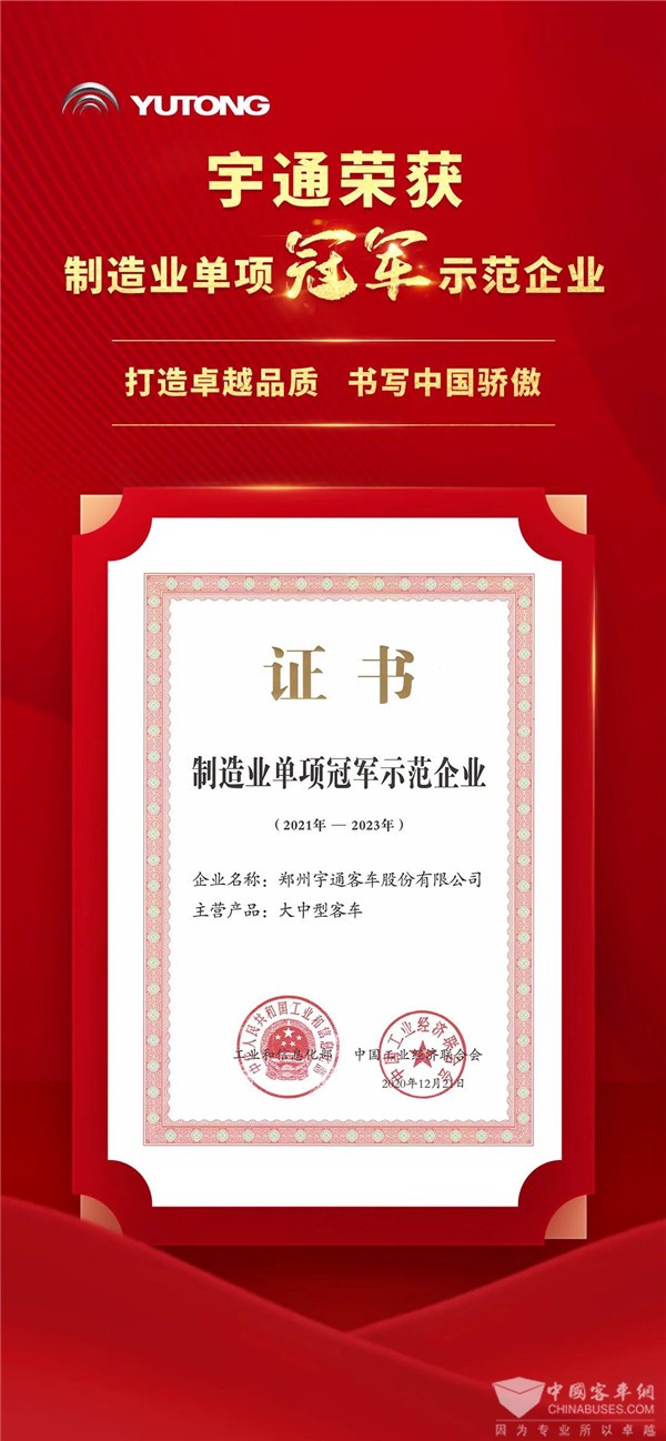 业内首家 宇通获评“制造业单项冠军示范企业”