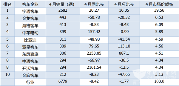根据中国客车统计信息网数据,2021年前4月大中客车TOP10份额变化情况: