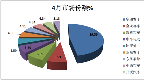 宇通客车4月销量2682辆夺冠,也是行业销量唯一超出两千辆级别的企业(同比增长20.27%,环比增长16.05%,而行业同比、环比均为负),是第二名销量的6.05倍,占据的市场份额近4成(39.56%),以绝对碾压式优势位居第一,可谓独占鳌头,一家独大,强者更强特征凸显;