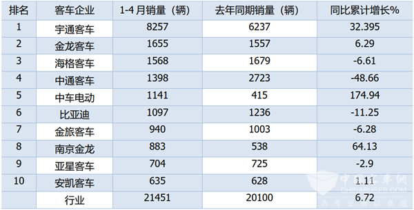宇通强势霸榜 金龙/海格居前三 开沃翻倍涨 前4月7米客车销量增长6.72%