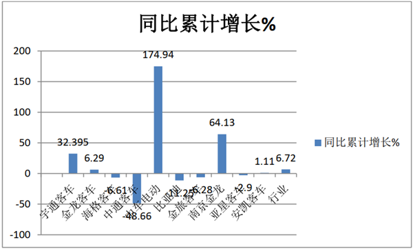 比亚迪客车客车累计销量1097辆,同比下降11.25%,位居第六;