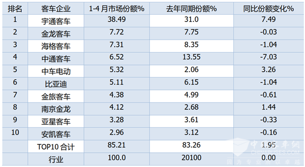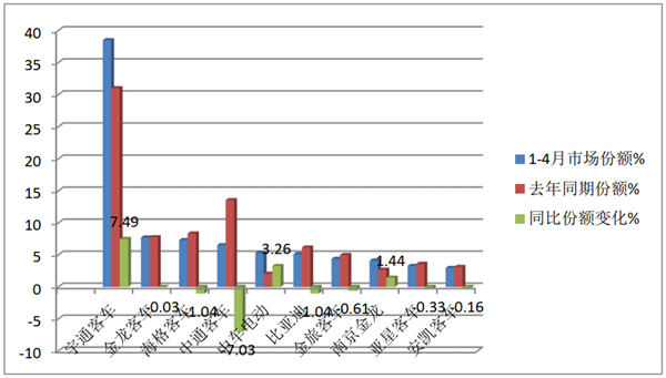 上图表显示,在2021年前4月大中客车TOP10市场份额及同比份额变化情况:
