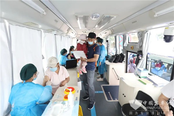 接种现场,来自街道和社区的工作人员带领社区志愿者开展信息登记、流程引导、秩序维护、留观服务等工作,居民也自觉排队,秩序井然。欧辉移动疫苗接种车车内有3个接种台,可以同时为3个居民接种,居民按流程完成核实身份、取药、注射,全程不到两分钟。居民留观30分钟后,如无特殊情况便可离开。整个接种过程高效、快捷,每小时可完成80人接种。