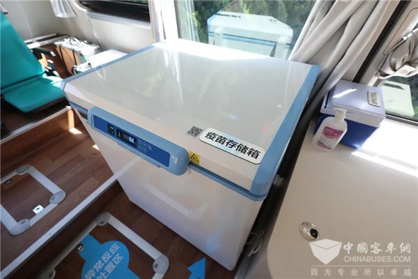 记者在现场看到车内区域分隔清晰,导向明显。登记、接种、留观各程序均为单向行进,避免了交叉往返。车载智控恒温存储冰箱可储存1000支疫苗,异常反应处置区配备了氧气瓶、除颤仪、急救箱等急救设备,车外等待区和留观区配备遮阳挡雨棚,可以说“十八般武艺样样精通”。