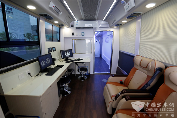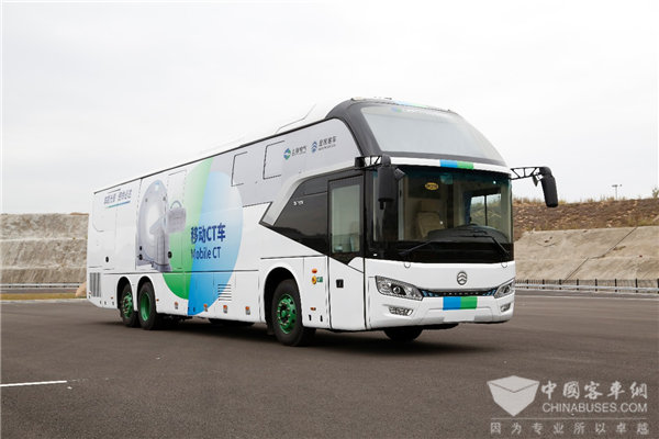 此次金旅推出的这款专属移动影像的重载医疗客车,整车总重达25吨以上,车长13.2米。采用金钢封闭环结构设计,底盘配备进口减震八气囊和液压平衡装置。CT机配备了独有的“金钢”行车锁止机构,锁定球管和旋转大部件,不受各种路况的颠簸和刹车时产生的前后冲撞扭力对CT设备带来的巨大伤害。为保障多场景的应用,整车配备了市电、锂电的双供电系统,AI人工智能和5G辅助诊断平台,为移动医学影像提供最优化解决方案。整车可装载16层到160层多款CT,还可加装DR或乳腺、超声和应急抢救设备。在疫情中,CT机房可变更为负压机房,为广大医疗机构提供多元化的重载型医疗客车。