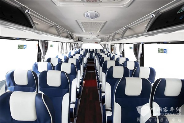 车外烈日炎炎,车内舒适如春,归功于其搭载的上海松芝旗下SZC系列客车专用空调,功率高达3.1万千卡/小时(49536瓦),是普通家用1匹空调(2324瓦)的21.3倍。另外,欧辉智能温控空调系统还采用车内两侧风道的高效送风模式,且具备数显自动温控、故障自动诊断等诸多智能管理功能,让温控更加自如。