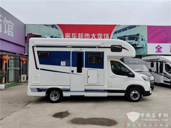 车辆外部,乘客门中置,带纱网、上方的遮阳棚为3*2m的尺寸,为手动形式、车门靠前的地方是明火版的外置柴油炉。除此之外,还配置有折叠式的后爬梯,700*500mm的储物舱,以及常规的房车充电口、营地组合式加水口。