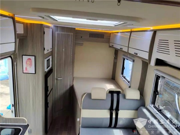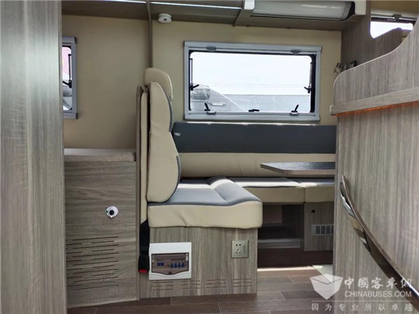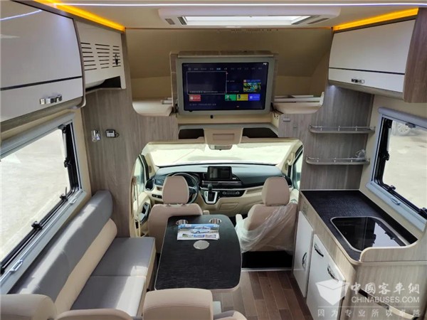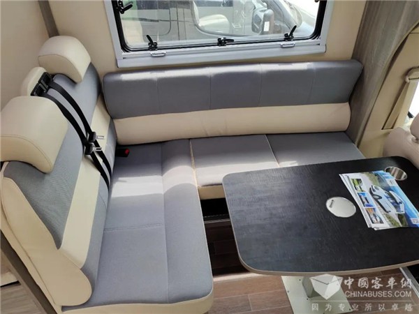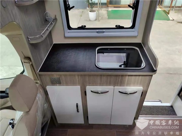 L型的沙发座椅,中间是一张升降桌,此处也可通过降下升降桌拼出一张供临时休息的床位。会客区占据车辆前部左侧区域,将右侧的空间留给了厨房区,所以车内的厨房区操作台面是很大的,做饭烹饪很便利。