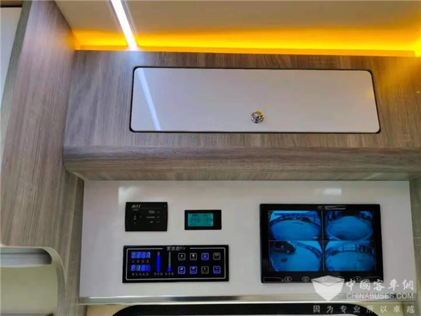 中门上方,后车的电路集成控制开关,车身360度监控的10寸独立屏幕都在此处。电力方面,车辆配备有12V-400Ah的锂电池,800W的柔性太阳能电池板以及一台3000W的充逆变一体机。