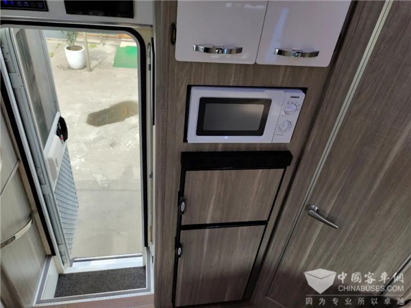 室内的厨房区分列车门左右两侧,左侧,超大的操作台面,告别盆盆碗碗没地方的尴尬,上面设计有带翻盖的冷热水龙头洗菜池;右侧,格兰仕的微波炉、弗罗斯特的85L车载冰箱,都是出行的好帮手。