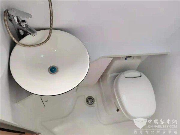 车上有独立的卫生间,内部配备有塞特福德盒式马桶、折叠式水槽、淋浴喷头、梳妆镜、毛巾架、双向换气扇等设施。在水路方面,食品级管路、配件总成,携带有120L食品级塑料清水箱、60L灰水箱。