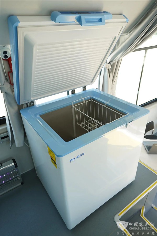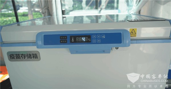 为保证疫苗的恒温保存,欧辉移动疫苗接种车配备一款可控温在2~8℃的医用冷藏箱,这款冷藏箱发泡层厚度达到100mm,是普通家用冰箱的发泡层厚度20mm的5倍。如此之厚的发泡层,可以大幅减少冰箱里外的冷热传递,减少压缩机的运作时间。