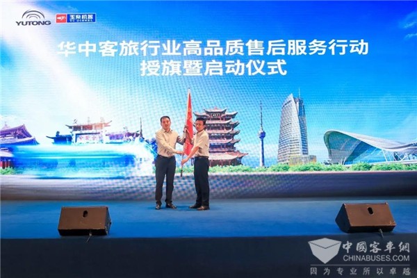 宇通客车国内营销副总监刘权立向服务团队代表授旗