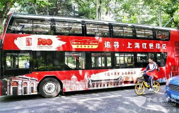 2021年5月25日上午9点45分,首趟“中国共产党一大·二大·四大纪念馆红色专线车”从上海中共二大会址纪念馆出发,开启试运行。印有“追寻·上海红色印记”字样、以中国红为主色调的安凯双层观光巴士,带领游客们开启了一场探寻上海红色力量,感知城市荣光的“初心”之旅。