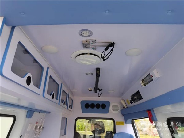 宇通医疗负压救护车,在每一辆车的驾驶舱后面,都有一个完全隔离的封闭式医疗舱,这个隔离医疗舱和普通救护车的医疗舱相比最大的不同就在于负压,即通过密闭性处理和装配负压装置将医疗舱内的空气压力控制在-10pa~-30pa之间。