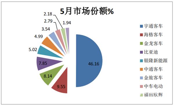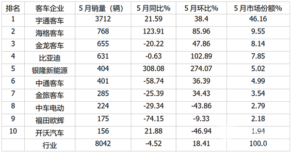 宇通客车5月销量高达3712辆,也是行业销量唯一超出3700辆级别的企业(同比增长21.59%,环比增长38.4%,而行业同比为负、环比18.41%),是第二名销量的近5倍,占据的市场份额近半壁江山(46.16%),以绝对碾压式优势位居第一,可谓独占鳌头,强者更强特征凸显;海格客车销售量768辆,位居第二,同比环比均大增,且跑赢客车大盘,占比9.55%,表现较为出色;金龙客车销售655辆,位居第三,同比,环比大增;占比8.14%;比亚迪销售631辆,同比微降,环比大增,占比7.85%,位居第四;银隆新能源客车销量404辆,同比大增308.08%,环比均大增274.07%,同比环比增幅均为行业最高,表现最抢眼;占比5.02%,位居第五,这也是银隆新能源第一次跃居行业前5的月份。