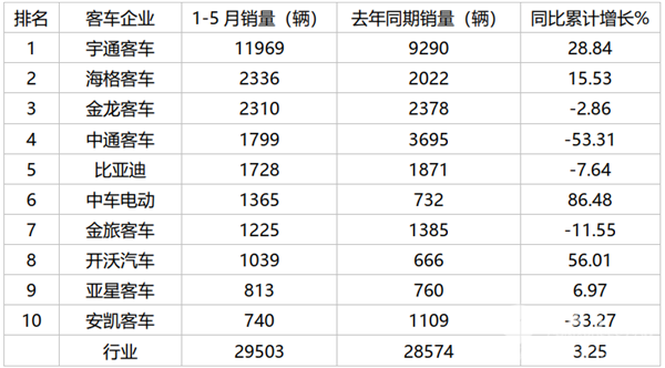 宇通累销近1.2万辆增28% 中车/开沃表现亮眼!前5月中大客车销售数据出炉