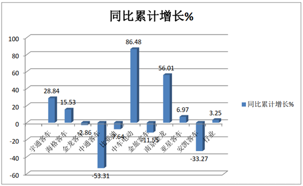 海格累计客车销量2336辆,同比增长15.53%,位居第二;金龙客车累计销量2310辆,同比下降2.85%,位居第三;中通客车累计销量1799辆,同比下降51.31%,位居第四;比亚迪客车累计销量1728辆,同比下降7.64%,位居第五。