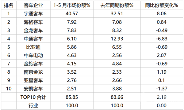 上图表显示,在2021年前5月中大客车TOP10市场份额及同比份额变化情况: