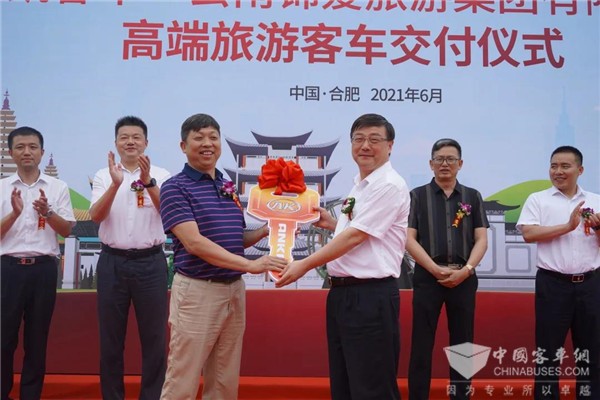 图丨安凯客车总经理查保应向云南锦爱旅游集团有限公司董事长朱洪应交付新车钥匙