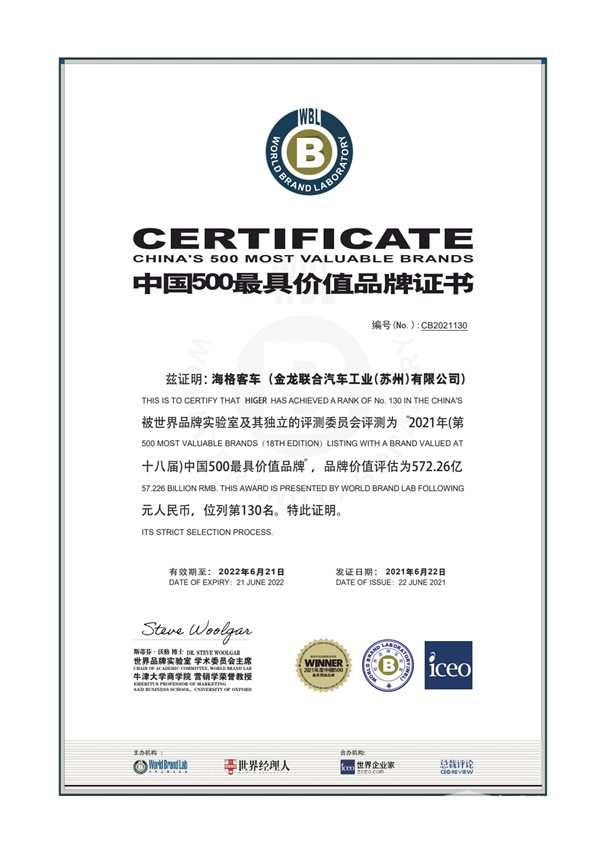 2021年6月22日,世界品牌实验室(World Brand Lab)正式发布2021年《中国500最具价值品牌》分析报告。苏州金龙海格客车连续14年登上“中国500最具价值品牌榜”,今年以572.26亿元的品牌价值位列第130位,海格客车品牌价值在持续创新中不断增值。
