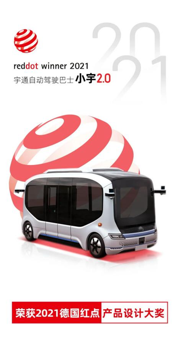 2021年6月25日,2021年红点奖正式揭晓,宇通自动驾驶巴士小宇2.0在众多全球顶尖设计作品中脱颖而出,荣获2021年红点奖(Red Dot Award),成为全球第一个获世界工业设计大奖的自动驾驶巴士,宇通也成为迄今为止唯一获得“红点奖”的中国客车品牌!这代表着宇通在工业设计、自动驾驶体验方面获得了国际设计界的肯定。
