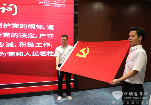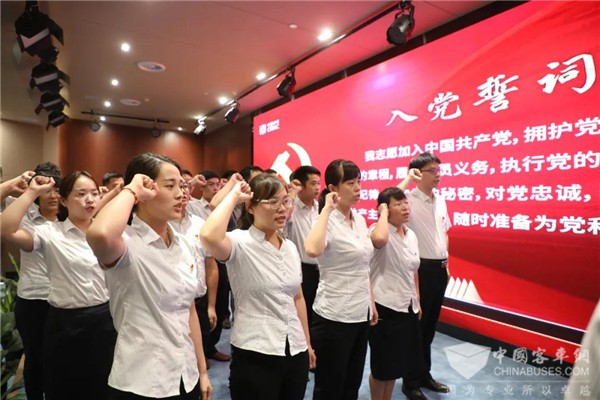 19名新党员面向鲜红的党旗庄严宣誓,会场全体党员重温入党誓词:“我志愿加入中国共产党,拥护党的纲领......”新党员为公司党组织注入新鲜血液。