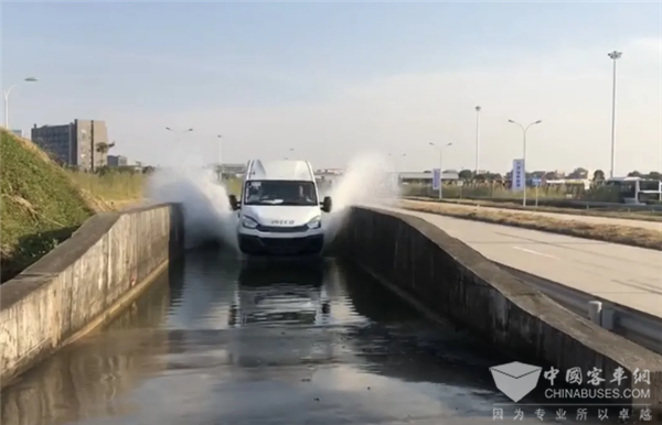 此外,依维柯的发动机进气系统在位于机盖上方,且进气口离地高度接近一米,排气囗距地面高度近300毫米,水浸风险小,再加上有着澎湃的动力支撑,让依维柯拥有优秀的通过性,在途经积水路段时,即使水位较深,也毫无压力。