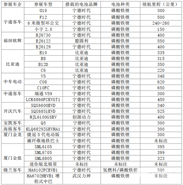 上表显示,此次展会,宇通客车、福田欧辉、比亚迪、中通客车、中车电动、安凯客车、开沃汽车等客车企业,共携40款整车产品参展,包括29款新能源客车和10款燃油客车以及1款氢燃料电池清洗车。在29款新能源客车中,搭载的电池以磷酸铁锂电池为主要技术路线,电池品牌以宁德时代占比最高,其次是比亚迪,具体如下表: