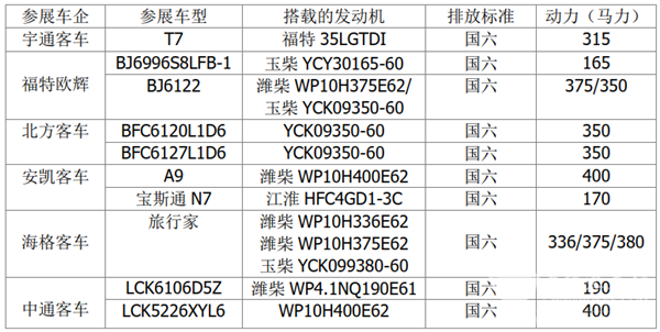 ●10款传统客车车型中,全部达到国六排放,搭载的动力以潍柴和玉柴发动机为主