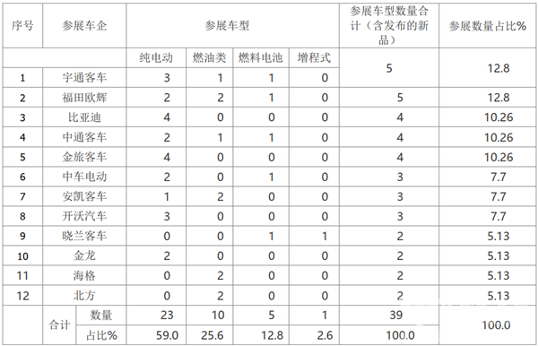 从客车整车企业参展数量我们不难看出,这次共有12个企业带来39款客车车型参展,其中宇通、福田欧辉参展车型数量最多,均为5款,占比均为12.8%,阵容最强大;其次是比亚迪、金旅和中通客车,这三家均带来4款车型参展,占比均为10.26%;然后是安凯客车、开沃汽车均带来3款车型参展,占比均为7.7%;第四是金龙、海格和北方客车、晓兰客车均带来2款(不含1款燃料电池清洗车)车型参展,占比均为5.13%。