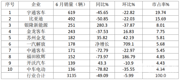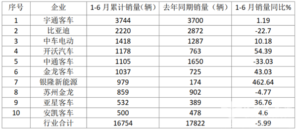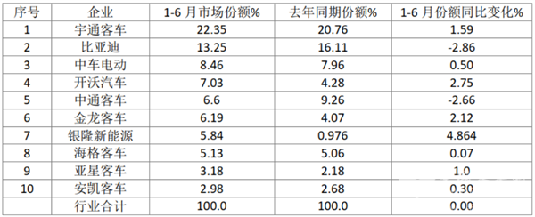 宇通夺冠 比亚迪/中车稳居前三 银隆暴涨462% 2021年1-6月新能源客车销量出炉