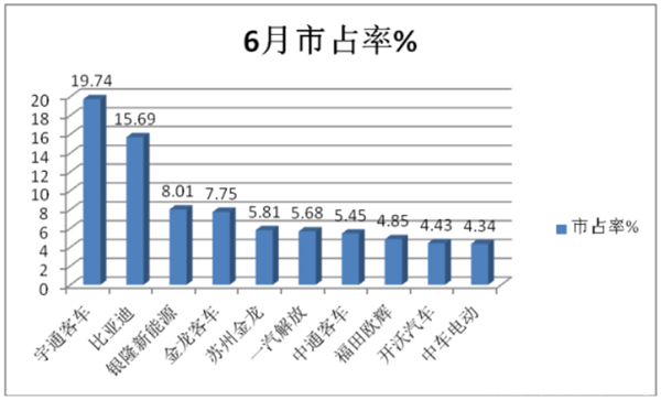 今年1-6月与1-5月排名比较,宇通、比亚迪、中车电动、开沃、中通、金龙、银隆、海格排名均未变,即分别位居第一到第八名;而安凯由第九降为第十,亚星客车由1-5月第10名上升到1-6月的第九名。也就是说,前8名排位没变,只是9-10名排名在变化,说明新能源客车的头部企业上半年的排次基本固定。