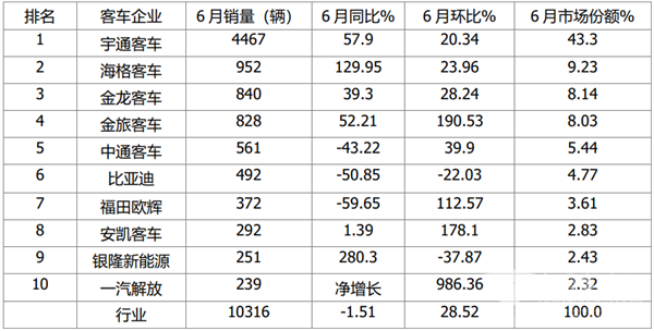 根据中国客车统计信息网数据,2021年6月7米以上客车top10排行: