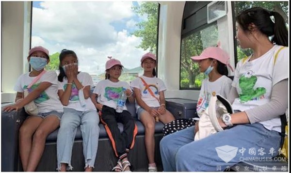 接下来的项目更是让孩子们兴奋不已,他们零距离体验了中国首款L4级自动驾驶巴士金龙阿波龙。阿波龙可爱的小黄鸭造型,让孩子们直呼“可爱”“呆萌”。车门一打开,孩子们迫不及待地飞奔上去,一双双眼睛好奇地打量着车内和车外。没有方向盘没有脚踏板的阿波龙缓缓行驶着,孩子们与自动驾驶工程师面对面交流、答疑解惑,阿波龙自动避让、超车等一系列神奇操作,激发了孩子们对科技强烈的探索欲望,收获最前沿的科技知识。