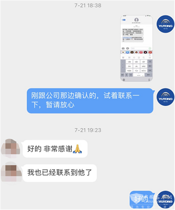 “我的朋友在宇通,联系不上,能帮我找一下吗”