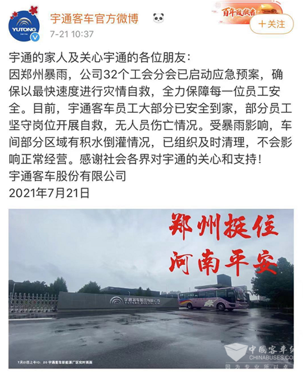 宇通客车通过微博向外界报平安