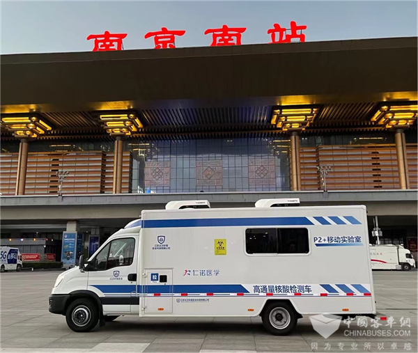 除此之外,当前正值南京疫情爆发,一时之间全市930万常住人口和来宁人员均需开展核酸检测。紧要关头,素有“移动实验室”之称的依维柯核酸检测车核酸检测车再次出征,驻守于南京南站,为来往人员24小时提供核酸检测服务,“麻雀虽小,五脏俱全”采检一体,90分钟便可出报告,全力保障南京南站核酸检测工作高效运转。
