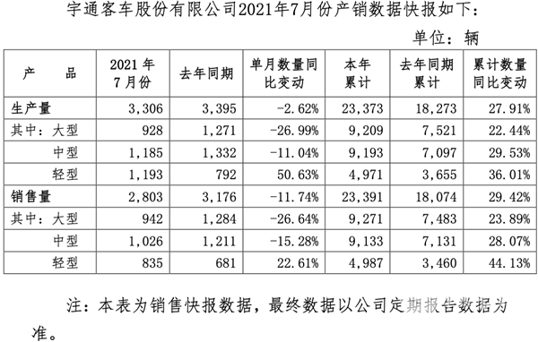 2021年8月3日,宇通客车发布了2021年7月份产销数据快报。数据显示,2021年7月份,宇通客车共销售客车2803辆,同比下降11.74%;2021年1-7月份,宇通客车累计销售客车23391辆,同比增长29.42%,大型客车、中型客车、轻型客车均呈现同比增长。稳健的发展态势为客车市场注入了信心与希望。