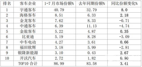 在2021年7月7米以上客车销量占比中,TOP10客车企业呈现以下特点: