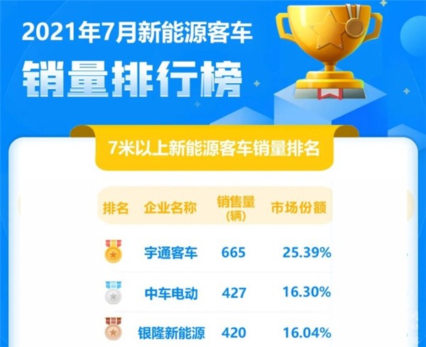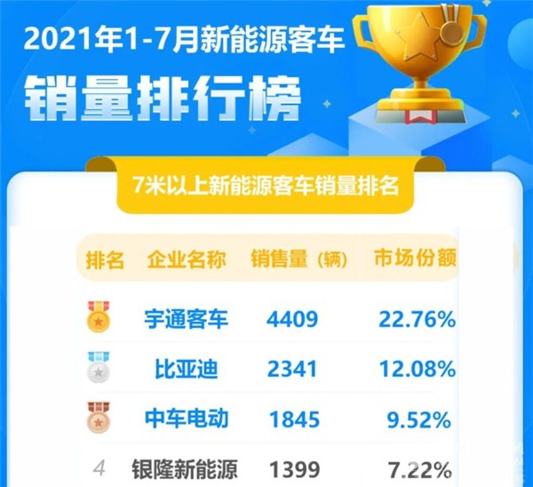 根据中国客车统计信息网数据显示及行业权威媒体报道,2021年1-7月国内销售7米以上新能源客车19373辆,7月月度销售2619辆。其中,银隆新能源7月销售7米以上新能源客车为420辆,位居行业第三,1-7月累计销售1399辆,位居行业第四。